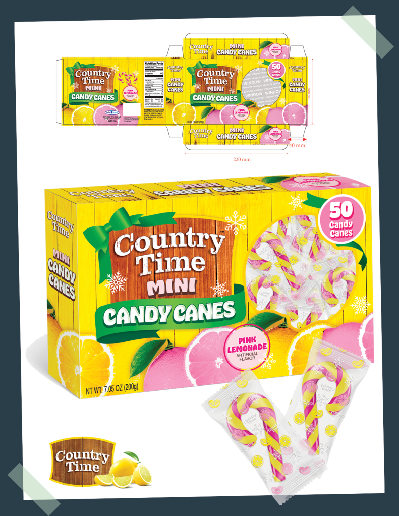 Designed the holiday mini cane, mini cane wrapper, and mini candy cane box for Country Time was a collaborative process involving careful coordination with licensing partners to ensure brand integrity and compliance. The design blends festive holiday elements with Country Time’s signature color palette and branding, creating an inviting and cheerful packaging that stands out on shelves. Attention to detail in licensing guidelines was paramount, resulting in a visually appealing box that captures the holiday spirit while honoring the Country Time brand.
